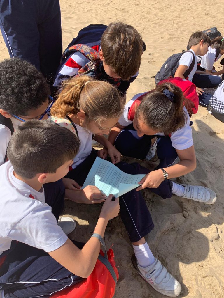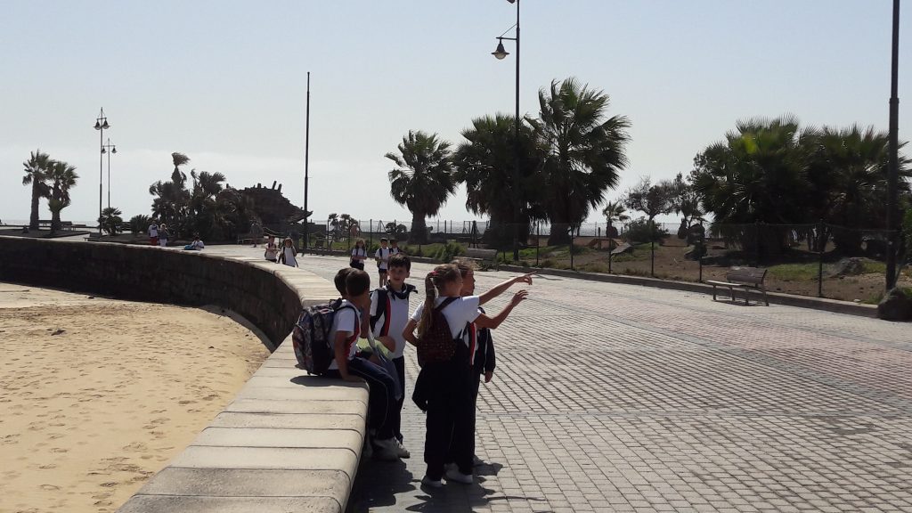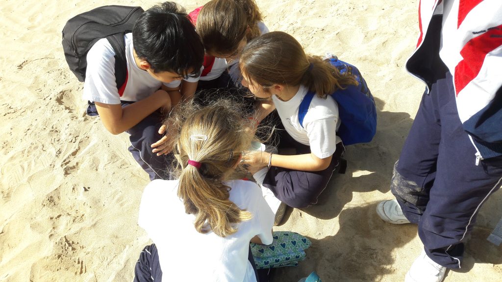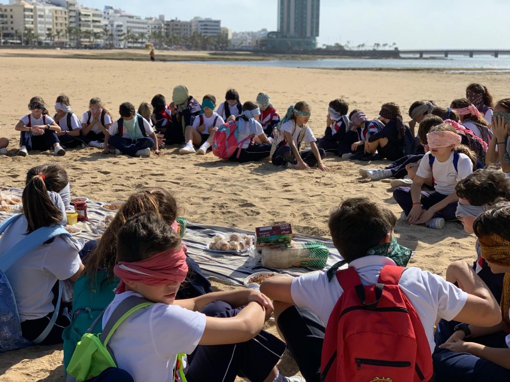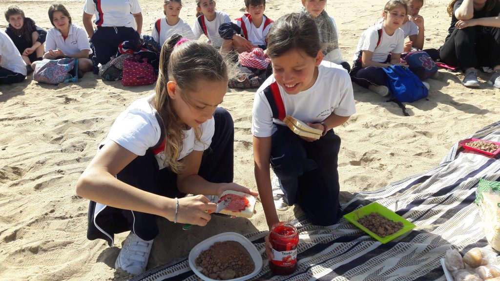 Esta fantástica semana empezó el pasado lunes, 11 de marzo, con una excursión sorpresa a la playa. Una vez llegamos, a ciegas, los llevamos a una zona de la playa en la que les habíamos preparado un gran desayuno con numerosos alimentos, rocas y minerales sobre la mesa como primer contacto con el tema a tratar.