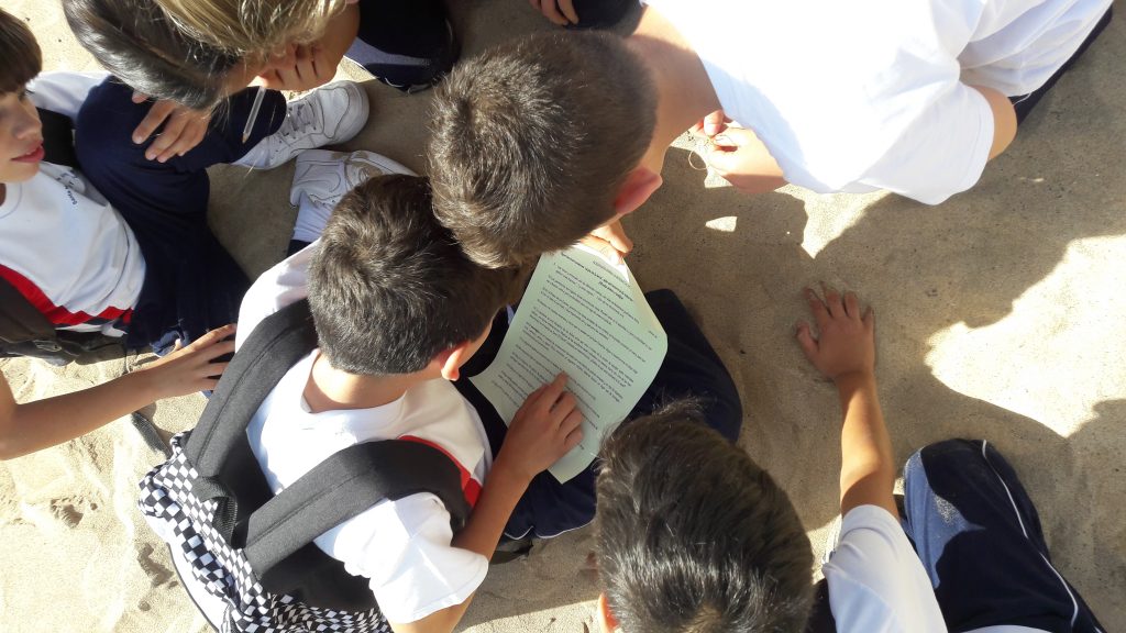 Después de comer, les explicamos la siguiente actividad: ¡La búsqueda del tesoro!. Previamente, los tutores escondimos 12 rocas y minerales por los alrededores y tenían que encontrarlos siguiendo e intentando descifrar diferentes acertijos lingüísticos y matemáticos.